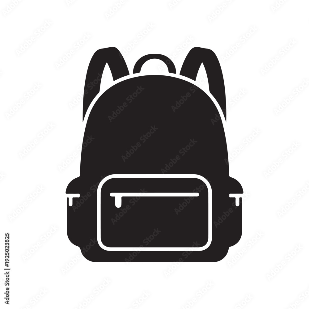 Black solid icon of backpack with two straps and front pocket isolated on white background simple school bag travel bag #1925023825