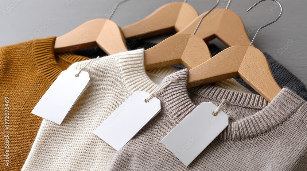 Blank swing tag label attached to textile on neutral seamless, clothing brand mockup, soft styling #1772675469