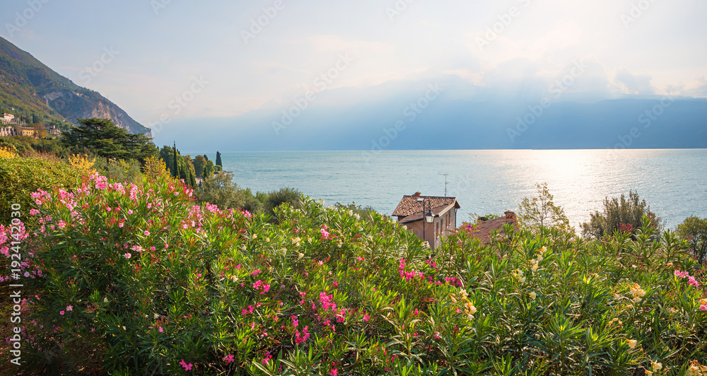 blooming oleander bushes, mediterranean landscape lake Gardasee, italy #1924142030