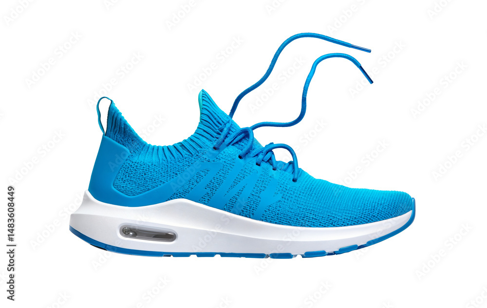 Blue Knit Sport Shoe Flying: Lightweight Athletic Sneaker with Air Cushion Sole for Running, Training. Footwear Tech, Fashion. Isolated on transparent background, PNG, cut out. #1483608449