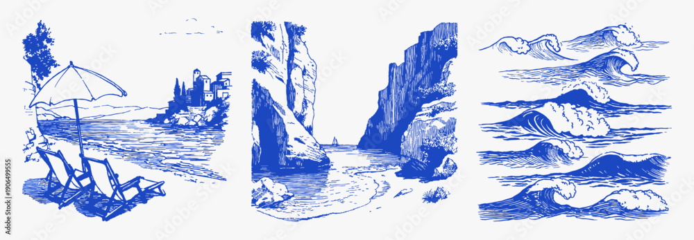 Blue summer beach umbrellas chairs coastal cliffs. Hand drawn sea coves, village shoreline and dynamic waves in vintage line art. Illustration for cards or wall prints. #1906499555