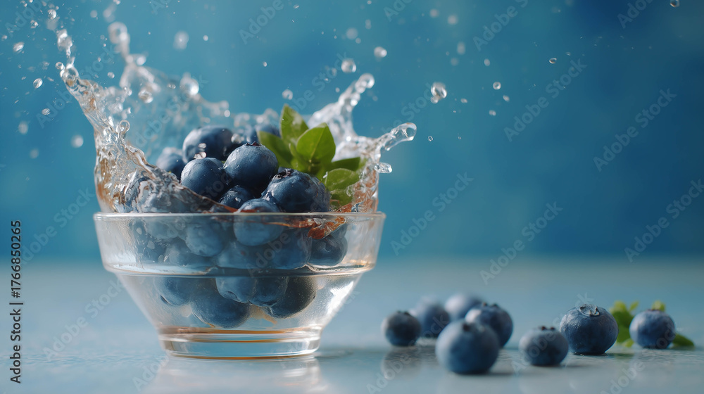 Blueberries splash into clear juice liquid with blue background. #1766850265