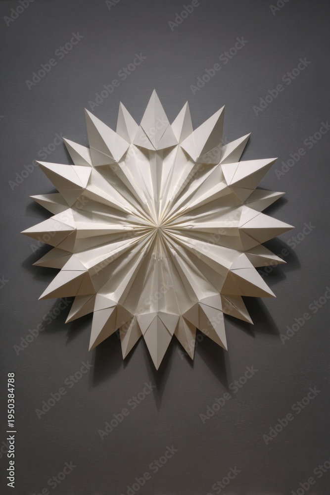 Bold geometric sun created from folded paper rays, minimalist abstract composition with strong graphic shapes. #1950384788