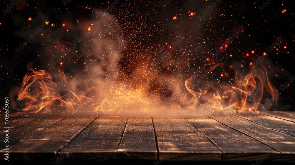 Burnt wooden table amidst flames. Wooden table with Fire burning at the edge of the table for display products. #705513051