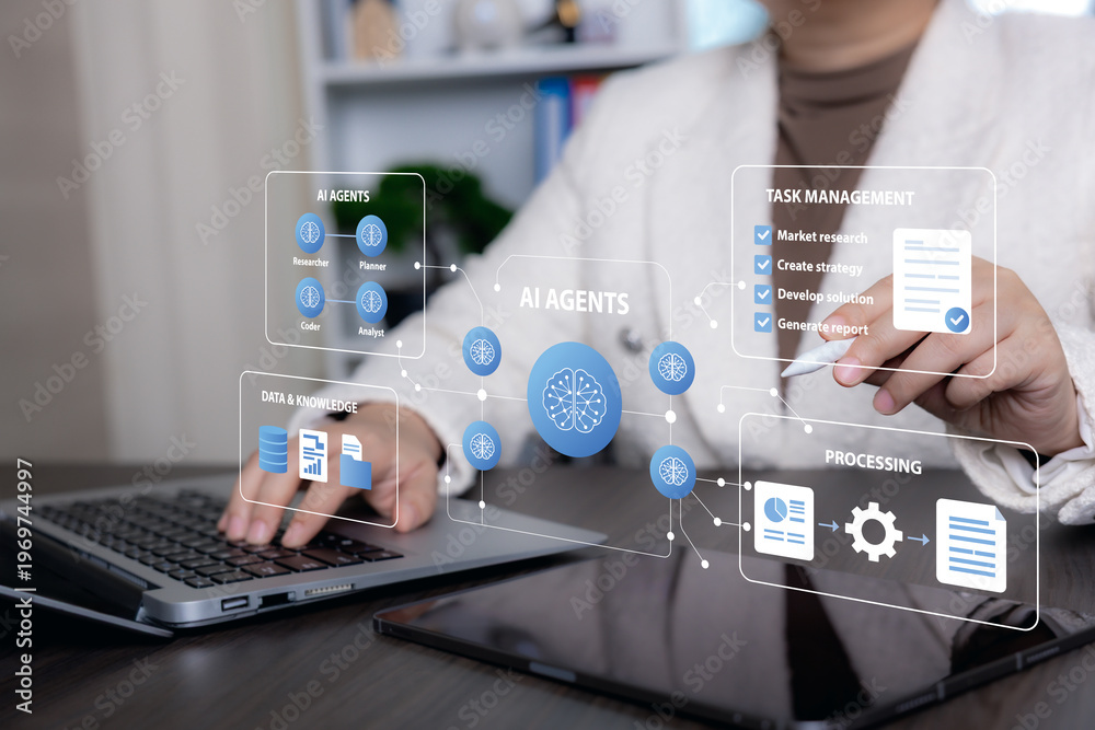 Business interface showing AI agents for task management, knowledge processing, research, planning, analysis, and automated workflow execution. #1969744997