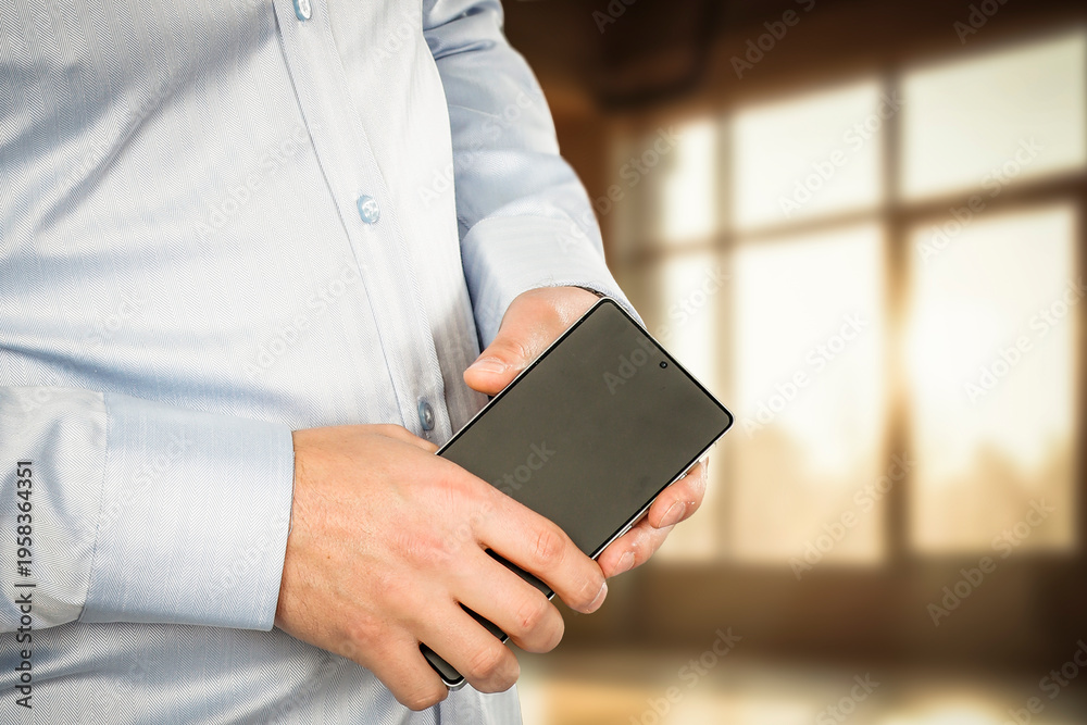 Businessman hands holding a smartphone, clean and neutral office background. Modern communication, digital business and mobile technology. #1958364351