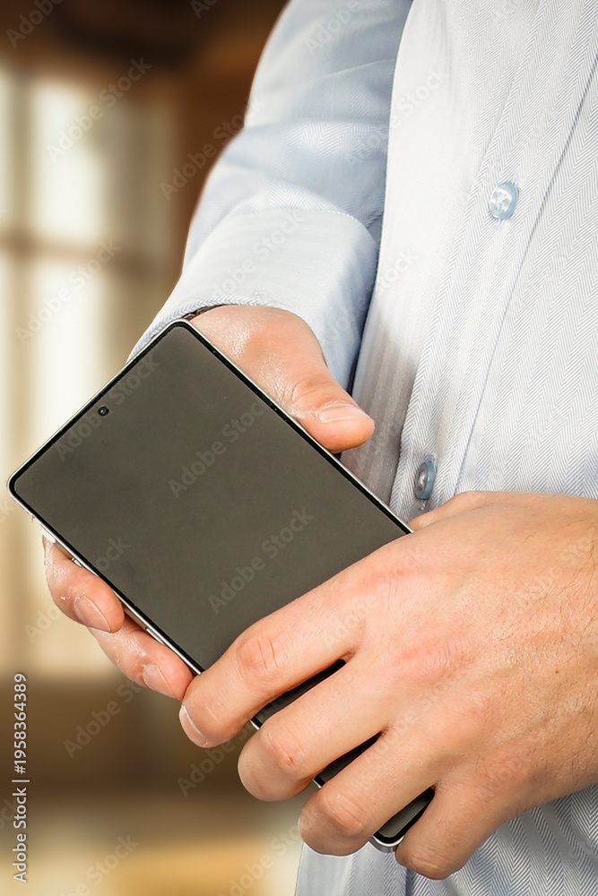 Businessman hands holding a smartphone, clean and neutral office background. Modern communication, digital business and mobile technology. #1958364389