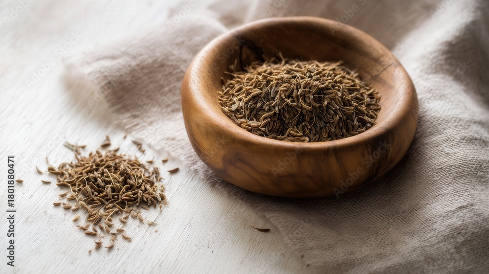 Caraway seeds in a wooden bowl on a rustic table close-up. Generative AI #1801880471