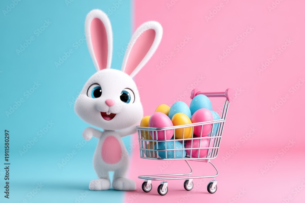 Cartoon Easter Bunny With Shopping Cart Full Of Colorful Eggs On Pink And Blue Background For Holiday Celebration And Seasonal Promotions #1911580297