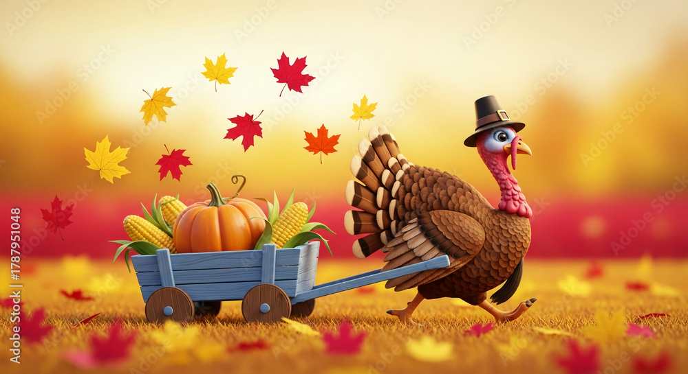Cartoon turkey in hat pulling wooden cart with pumpkin and corn, surrounded by falling maple leaf, representative of Thanksgiving Day holiday #1787951048