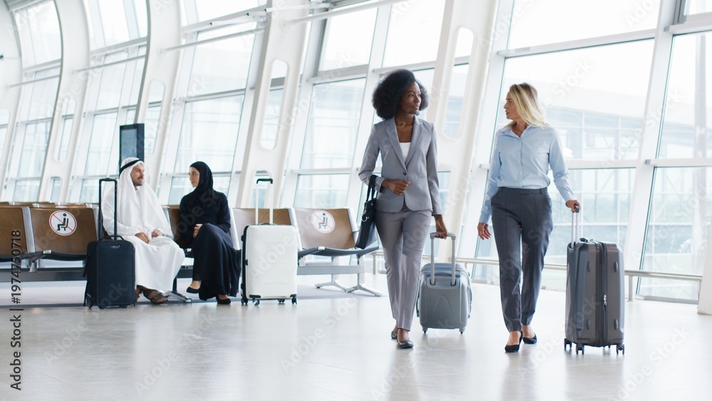 Caucasian attractive businesswoman in business style and her multiracial colleague walking through the corridor of the airport with suitcases, speaking and waiting for the plain #1974750718