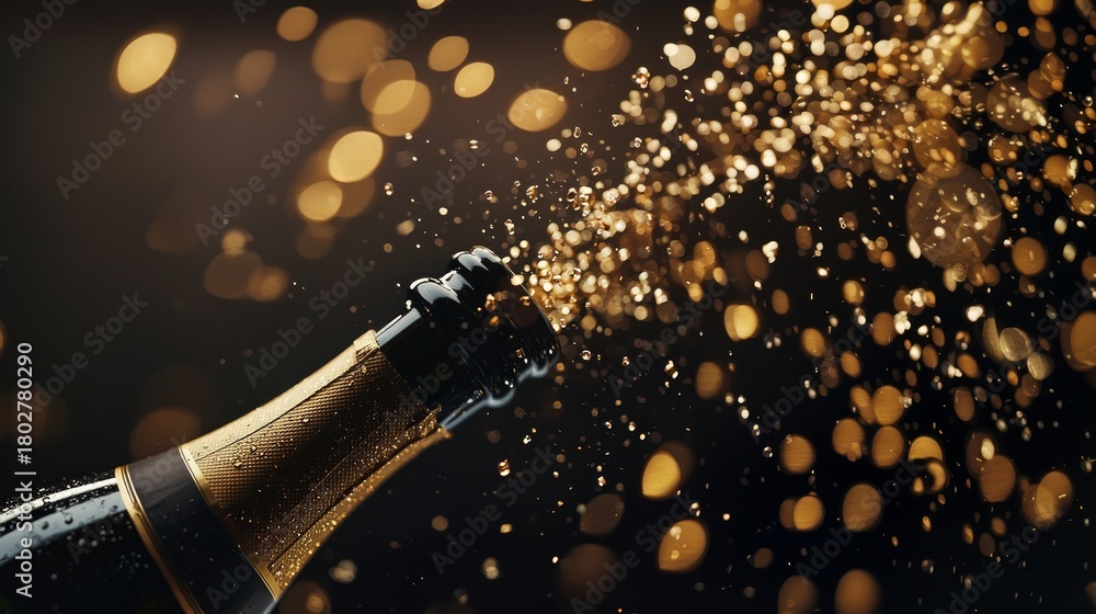 Champagne bottle popping open with sparkling gold liquid and bokeh lights. Celebration party concept for New Years Eve #1802780290