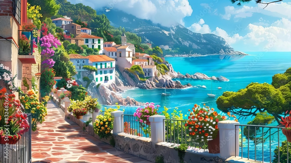 charming seaside town in spain colorful flowers and fences turquoise ocean view idyllic mediterranean landscape digital painting #832482660