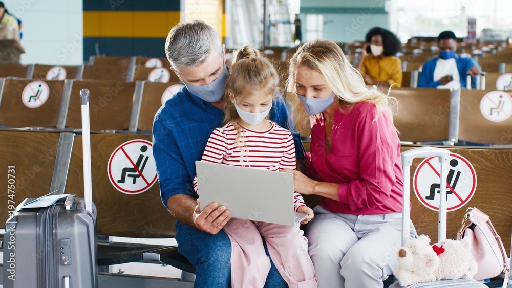 Cheerful family of parents and their daughter wearing protective masks watching something on the laptop computer while waiting for their departure in the airport #1974750731