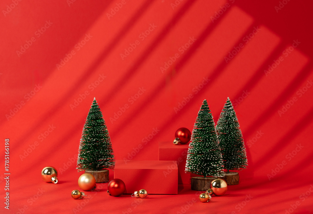 Christmas product display scene with Christmas trees, red background and festive baubles. Holiday composition for product presentation, gift branding, seasonal advertising and Christmas marketing. #1785166198