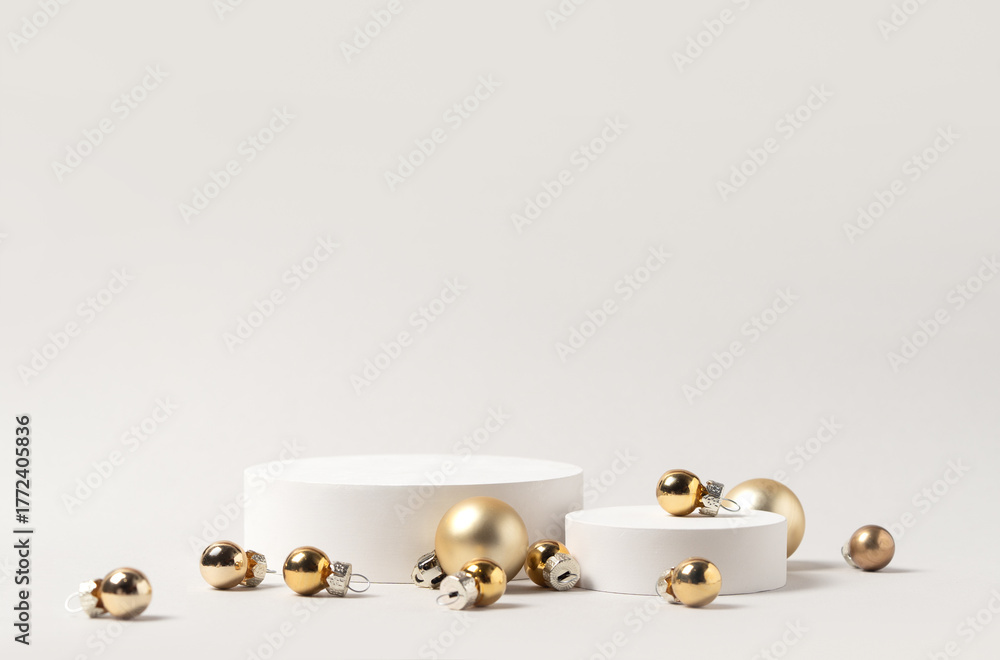 Christmas product presentation scene with white round podium and scattered gold baubles on clean background - elegant festive mockup for product, gift, and holiday display. #1772405836