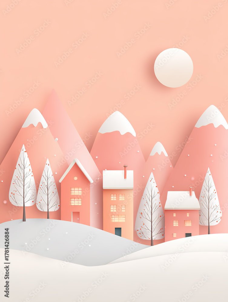 Christmas-themed illustration of a small house under a snow-capped mountain #1781426884