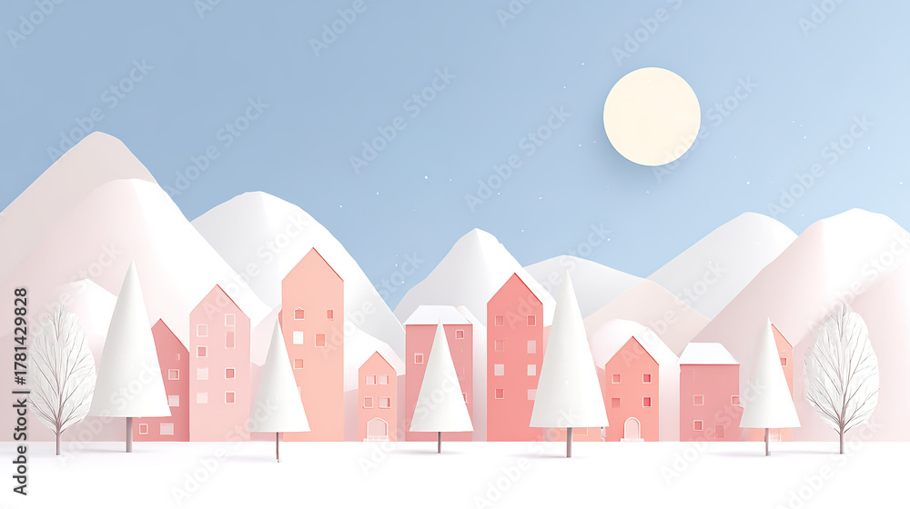 Christmas-themed illustration of a small house under a snow-capped mountain #1781429828