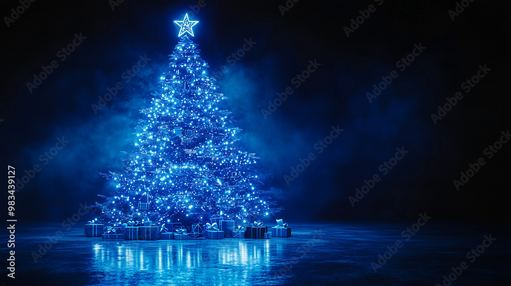 christmas tree featuring artificial intelligence and technology, illuminated with blue neon lights and surrounded by virtual reality gifts #983439127