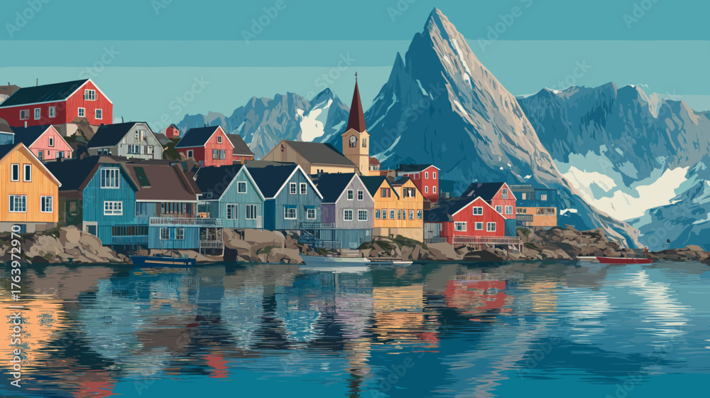 Cityscape of ilusat, city of Greenland, attractive touristic advertisement poster, beautiful touristic must-see destination. Beautiful tourist destination, in Northern europe. Amazing travel destinati #1763972970