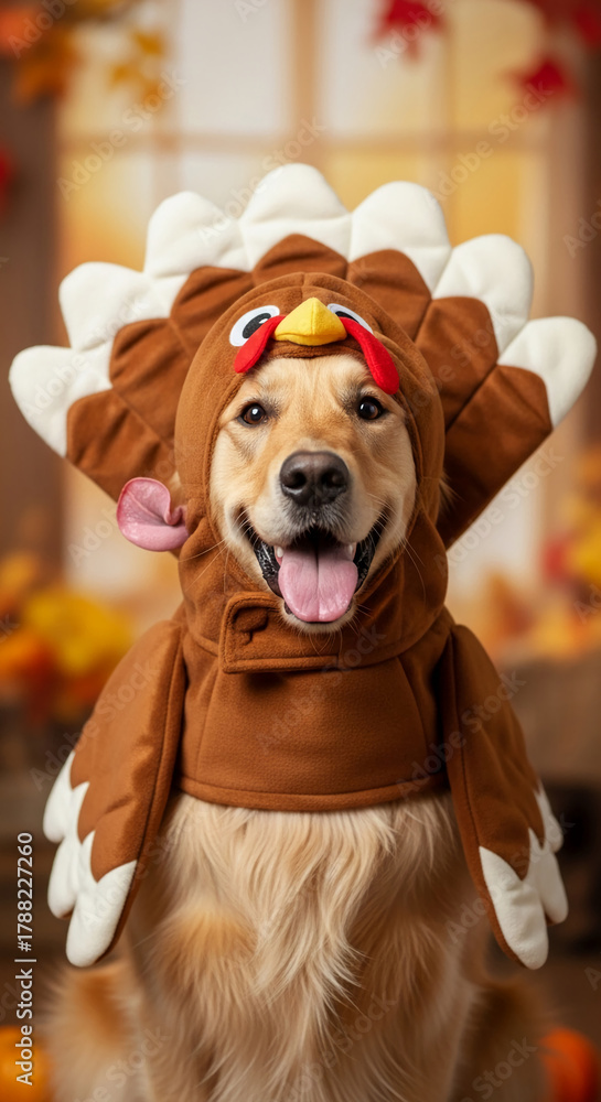 Close-up of a golden retriever dog in a brown turkey costume, symbolizing autumn celebration, festive spirit, and humor, perfect for Thanksgiving themes #1788227260