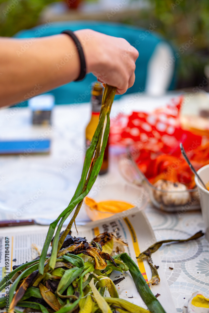 Close-up of a hand peeling a traditional Catalan calçot on the grill on newspaper during a Catalan calçotada. #1937184387