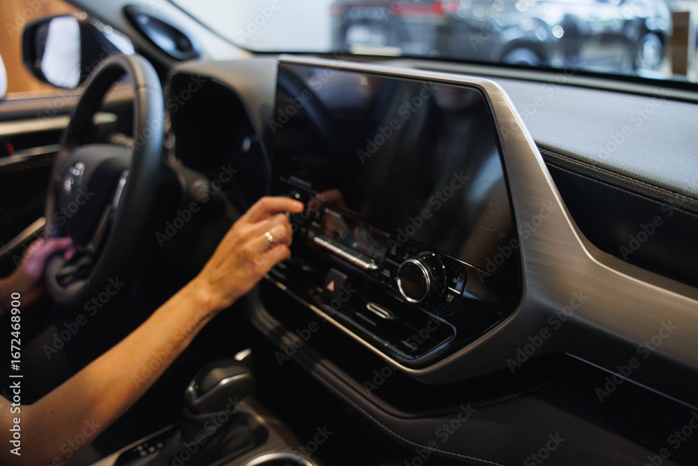 Close-up of a person using a touchscreen in a contemporary car interior, showcasing advanced technology and sleek design. #1672468900