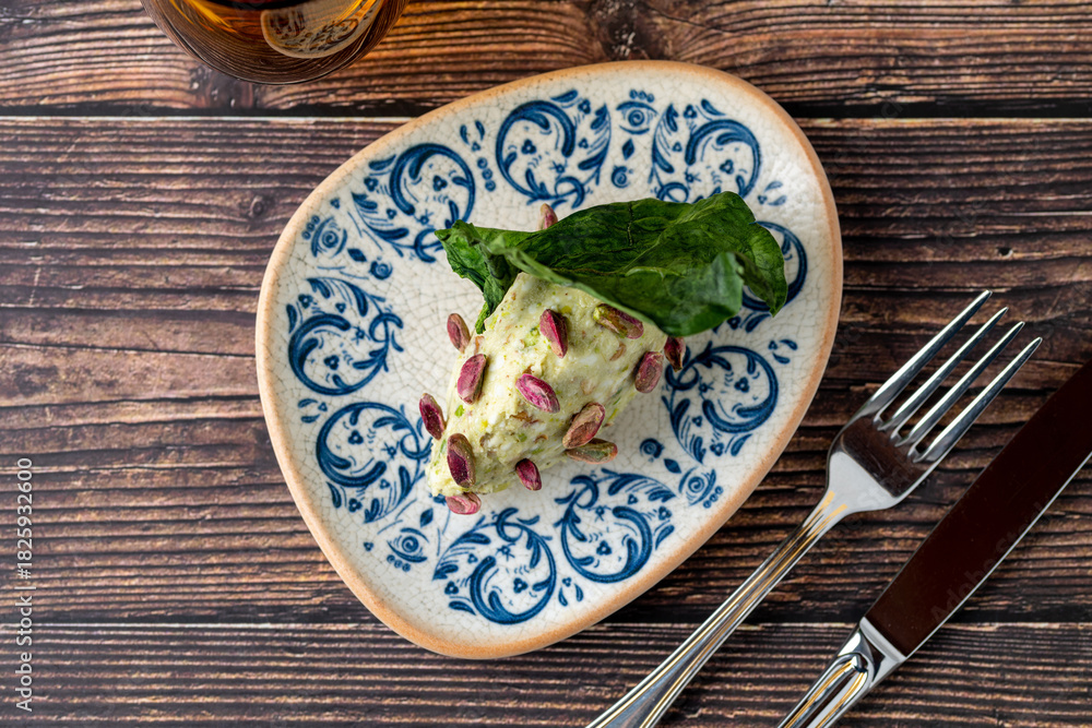 Close-up of pistachio cream dessert garnished with whole pistachios #1825932600