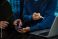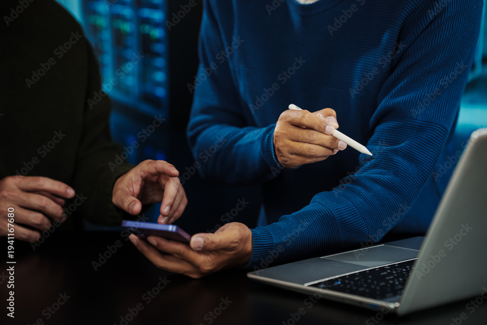 Close-up of two coworkers collaborating, using smartphone and stylus beside laptop in modern office, blue lighting, tech and productivity concept #1941167680