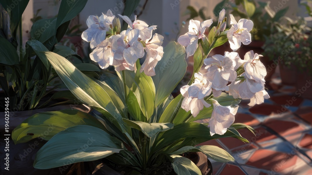 Close up of vibrant white flowers with green leaves illuminated by sunlight #1960259465