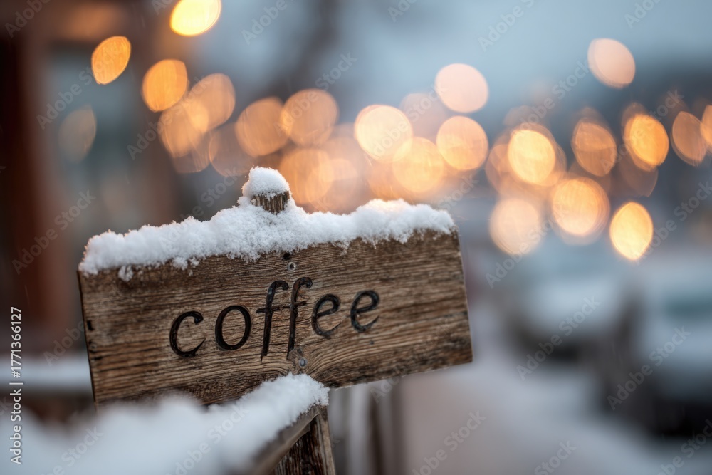 close-up of wooden sign "coffee" half covered with snow, soft bokeh lights in background #1771366127