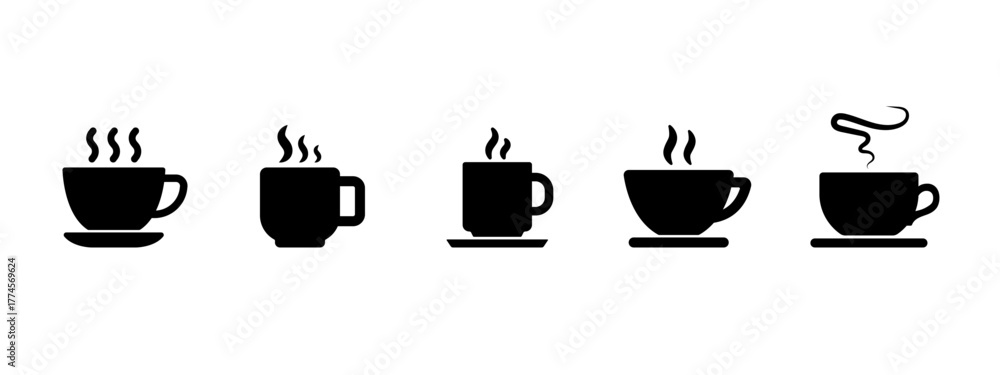 Coffee cup icon set. Black silhouette symbols of hot drinks, tea, and espresso mugs with steam. Vector illustration. #1774569624