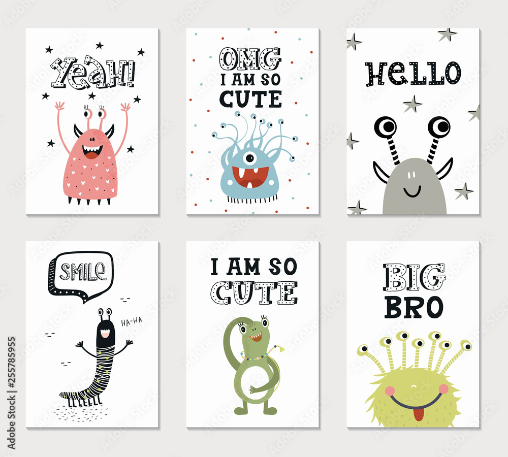 Collection of children cards with cute monsters and lettering. Perfect for nursery posters. Vector illustration. #255785955
