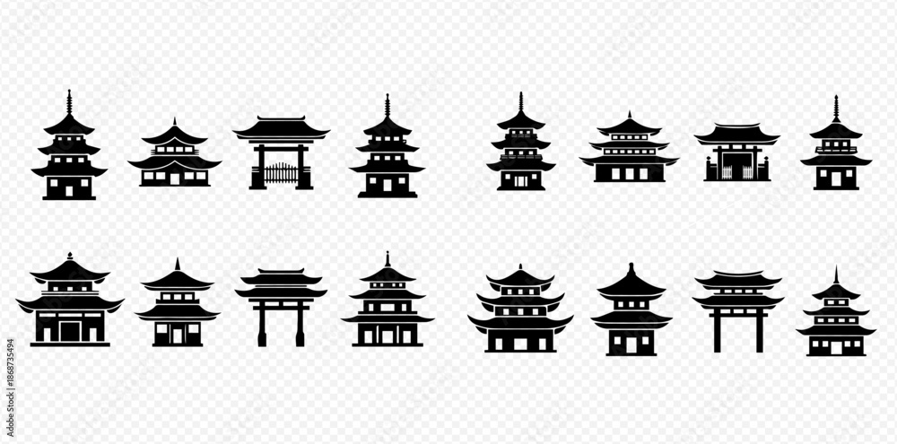 Collection of traditional Asian temple and pagoda silhouettes, representing ancient architecture and cultural landmarks. #1868735494