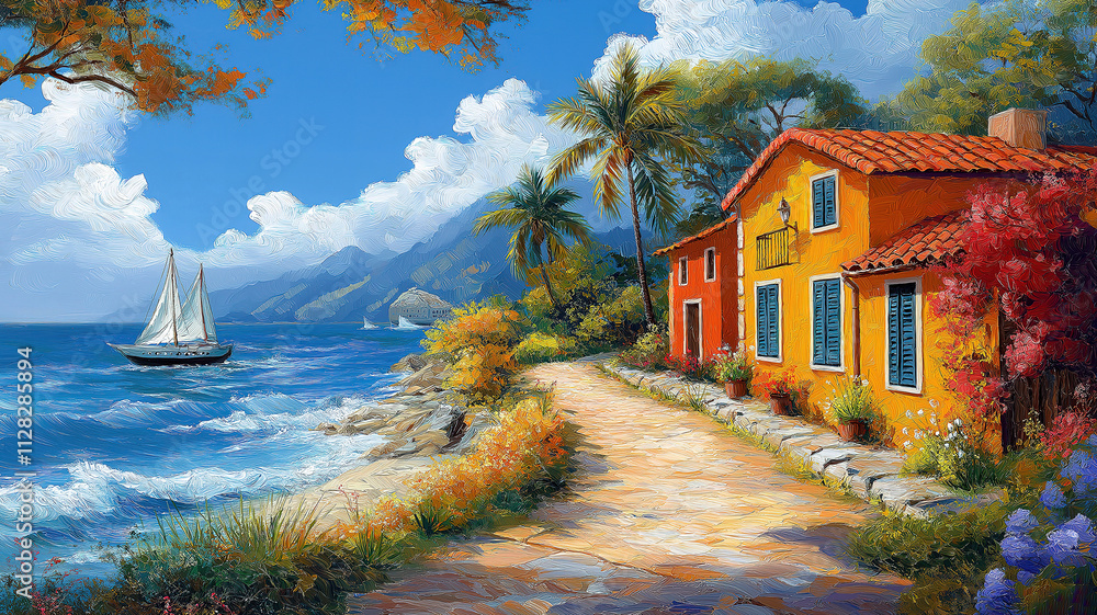 Colorful Coastal VA vibrant, painterly landscape showcasing a picturesque coastal village.illage Scene with Sailboat, perfect for home decor. #1128285894