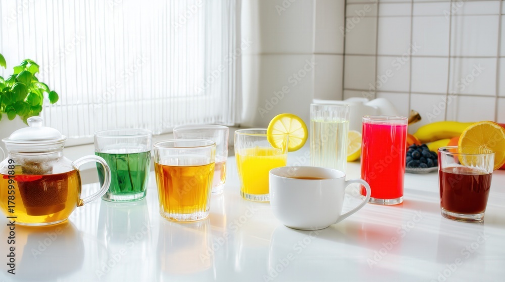 Colorful drinks and teas on bright white kitchen table isolated. Generative AI #1785991889