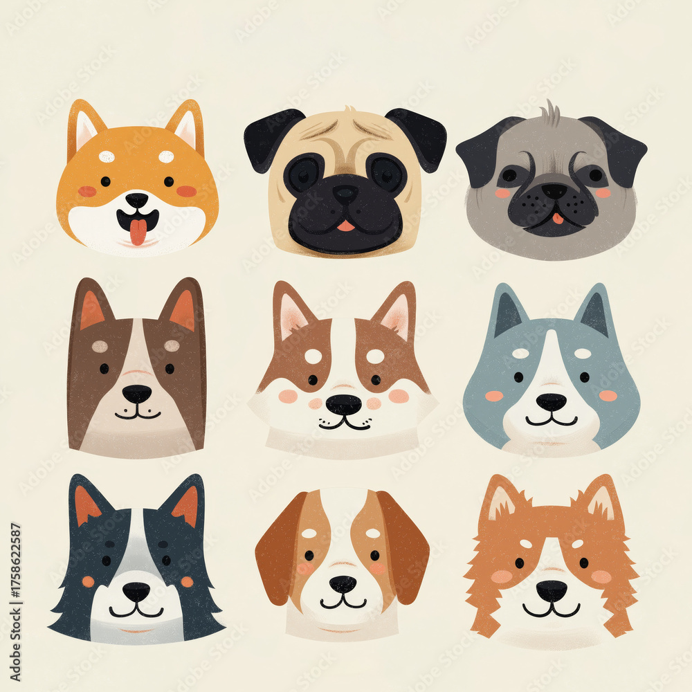 Colorful illustrations of dog faces featuring different breeds arranged in a creative layout #1758622587