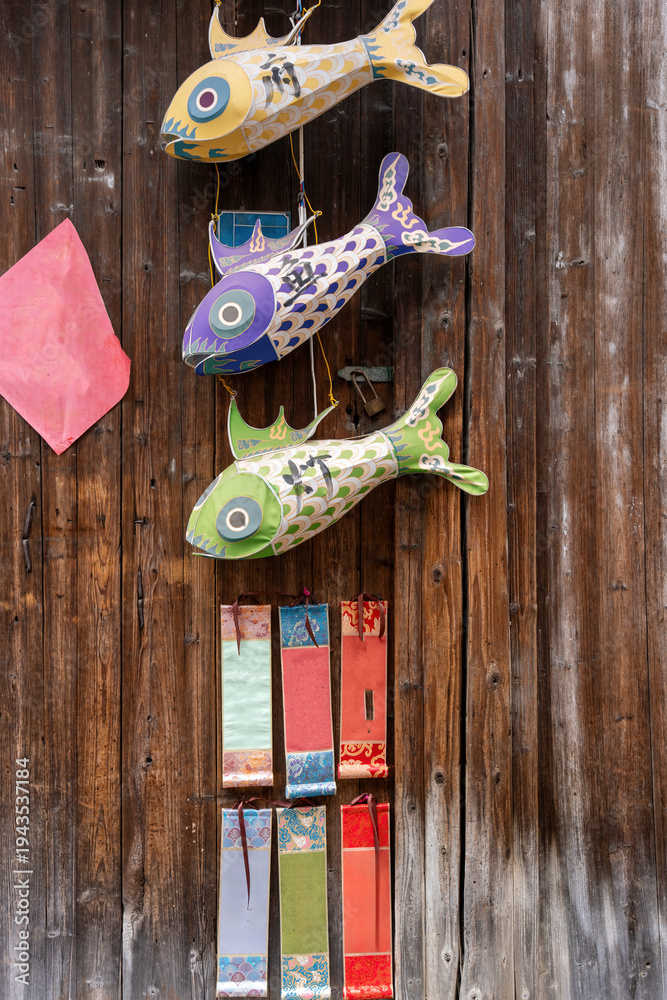 Colorful Paper Fish Decoration on Wooden Wall #1943537184