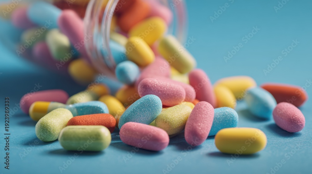 Colorful pills spill on blue surface #1923989333