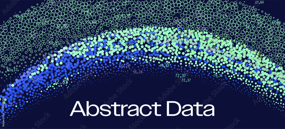 Colorful vector wave of gradient particles with numbers on dark background. Conceptual vector illustration for abstract data and particle visualization themes. #1942012926
