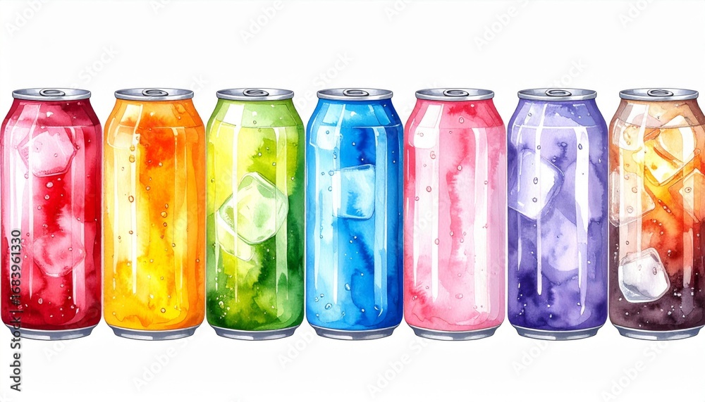 Colorful Watercolor Beverage Cans with Ice Cubes on White Backgrounds for Refreshment #1683961330