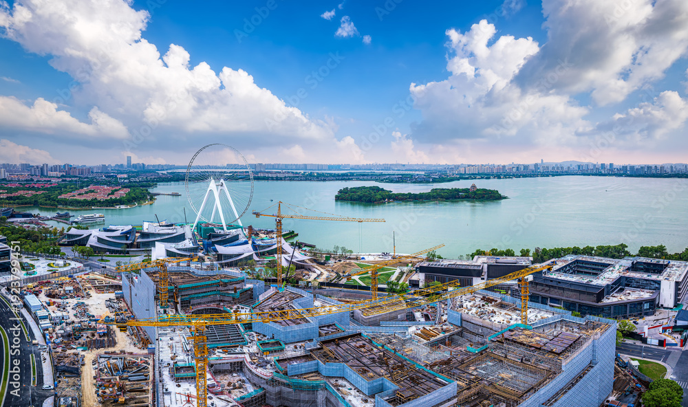 Construction site with tower cranes building modern architecture near Jinji Lake in Suzhou. #1923799451