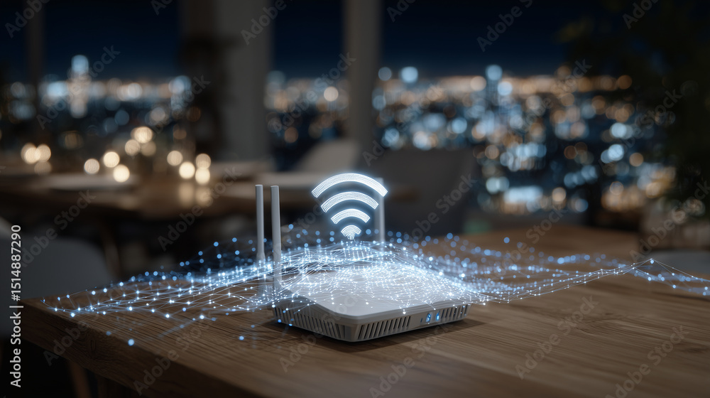 Contemporary Wi-Fi router on a wooden table with a three-dimensional glowing signal icon above, surrounded by animated graphics of data streams and connected devices, illustrating #1514887290