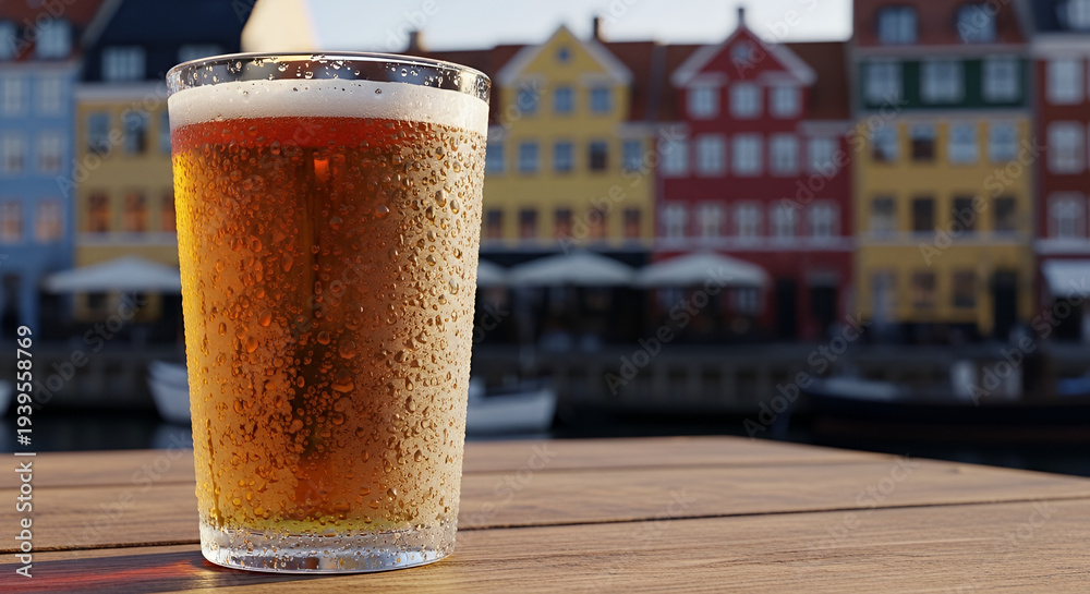 Copenhagen Beer Week, A close-up of a frosty craft beer glass with condensation, placed on a rustic wooden table with the iconic colorful houses of Nyhavn blurred in the background #1939558769