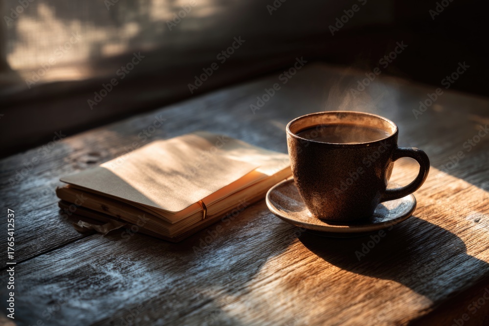 cozy home office desk with laptop and coffee cup under soft sunlight, minimal beige aesthetic #1765412537