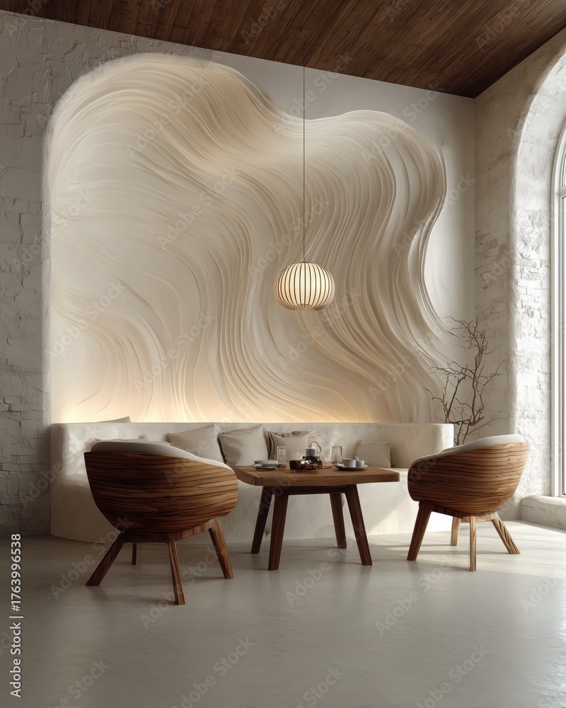 Cozy minimalist dining area with textured wall and natural lighting for modern interior design. #1763996538