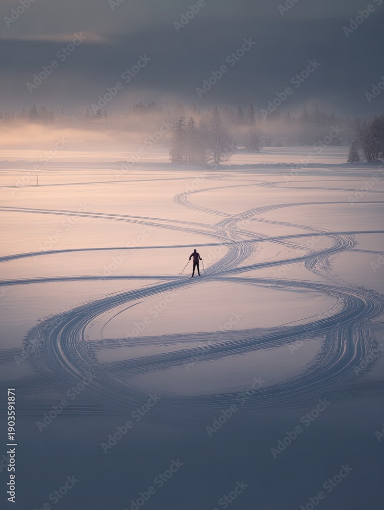 Cross country skier at dawn, breath visible, landscape flattened into soft gradients, motion trails forming five overlapping loops, intimate DOF, poetic endurance, cinematic still #1903591871