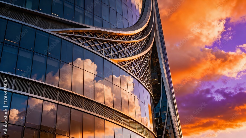 Curved glass skyscraper with lattice ribs reflecting orange sunset clouds, facade closeup in foreground, purple sky with dramatic cumulus in background, concept of futuristic architecture, innovation #1765496057