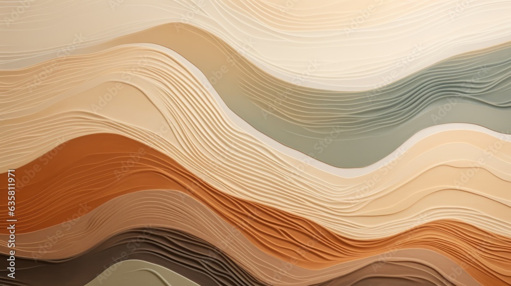 3D horizontal wavy texture background. Carved abstract realistic decoration textured waves on wood. AI 3d illustration. Trendy geometry wallpaper interior design. Structure art backdrop, macro.. #635811971