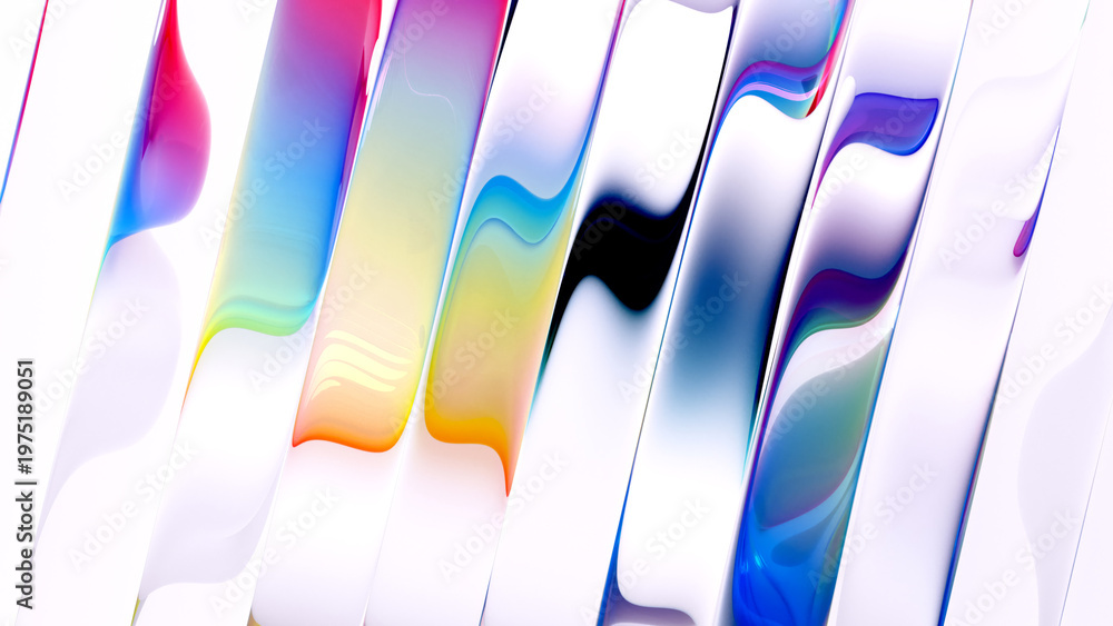 3d render of abstract art of a surreal 3d background based on liquid glass sticks in rotation movement in curved wavy, smooth and soft organic lines forms in white and color gradient parts #1975189051